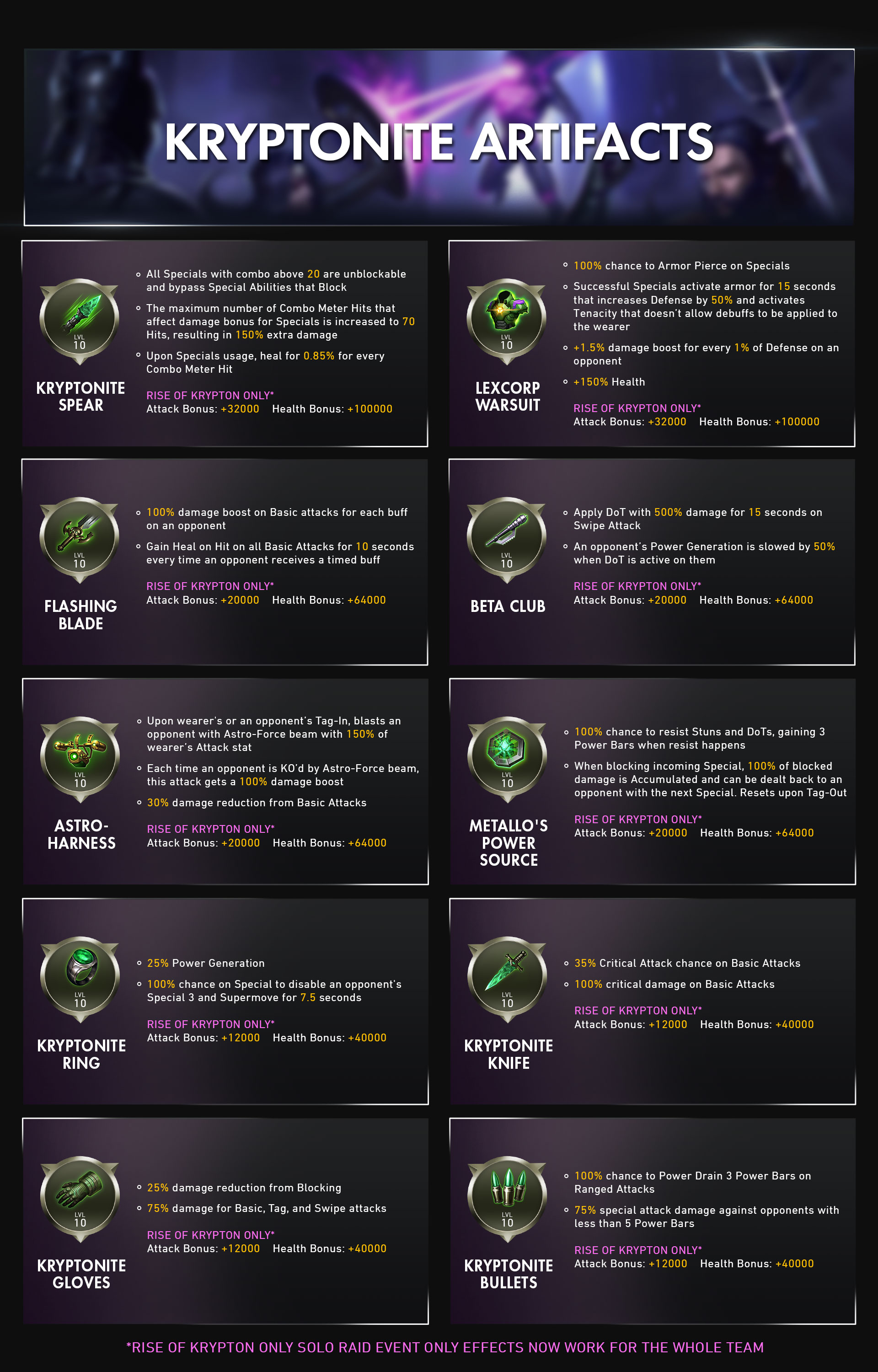 Twitter 上的injustice 2 Mobile Here S A Sneak Peek Of The New Kryptonite Artifacts Riseofkrypton Solo Raid Event Only Effects Will Now Work For The Whole Team Not Just The Hero Wearing The